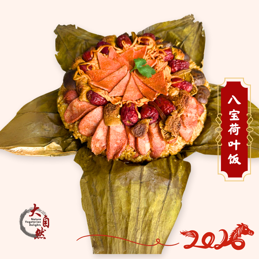 Indulge in the richness of Nature’s Eight Treasures Lotus Rice, NVD’s signature glutinous lotus rice elevated with a carefully curated selection of premium ingredients. Every serving is packed with natural goodness — gingko nuts, Lijiang red dates, chestnuts, Brazilian mushrooms, cordyceps flower, and king oyster mushrooms — creating a beautifully fragrant, nourishing and flavourful dish. Steamed to perfection and wrapped in lotus leaf for added aroma, this Eight Treasures Lotus Rice is a festive favourite that brings warmth, abundance and wholesome satisfaction to any celebration. Perfect as a centrepiece for family gatherings, corporate events, or special occasions.
