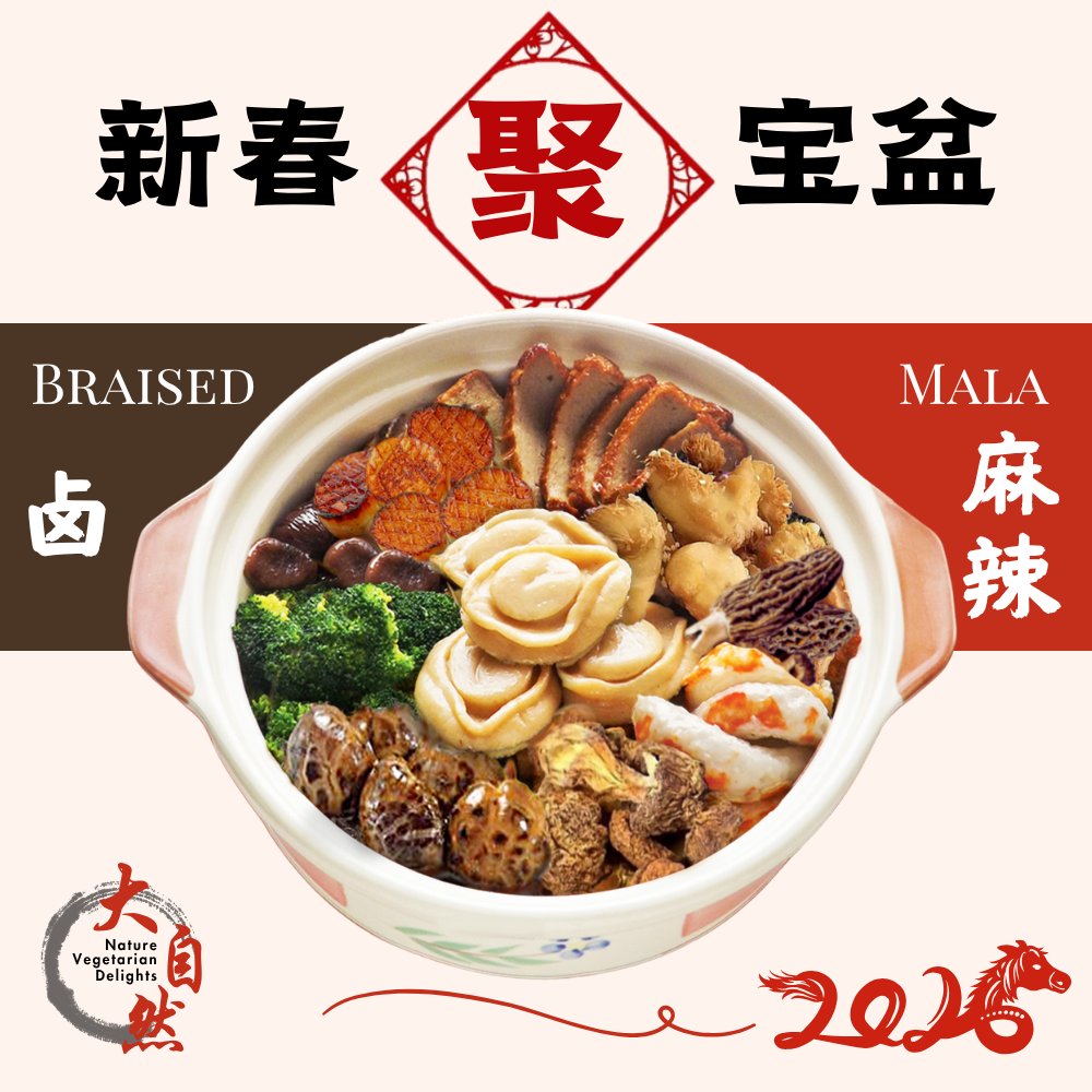 (2) 新春聚宝盆 Nature’s Treasure Pot – your choice of Braised or Mala flavour, showcasing premium plant-based ingredients in a symbolic pot of unity;